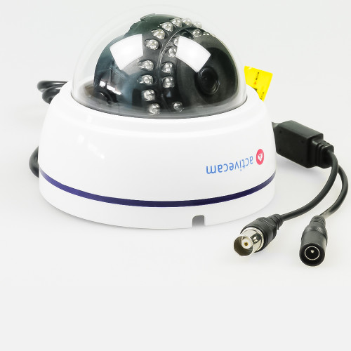Модель ActiveCam AC-TA381LIR2 выполнена в форм-факторе минидом, поставляется с мегапиксельным объективом 3.6 мм и конструктивом крепления 3-axis. Набор интерфейсов представлен: BNC-разъемом аналогового видеовыхода и портом для подключения источника питания 12 В. Для облегчения процесса настройки и монтажа камеры имеется экранное OSD-меню с управлением как при помощи джойстика, так и по коаксиальному кабелю (UTC) в интерфейсе регистратора.
