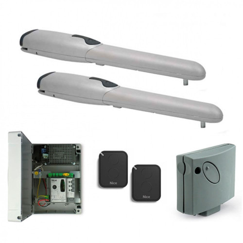 Комплект Nice WINGO2024KCE для автоматизации распашных ворот со створками шириной до 2 м, весом до 400 кг состоит из двух электромеханических приводов WG4024, блока управления MC424L, двух пультов ДУ FLO2RE.