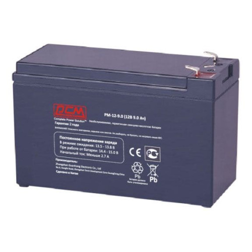 Батарея Powercom PM-12-9.0 с номинальным напряжением 12 В и емкостью 9 А·ч относится к необслуживаемым, герметичным, свинцово-кислотным аккумуляторам для ИБП, систем охранной и пожарной сигнализации, аварийного освещения etc.