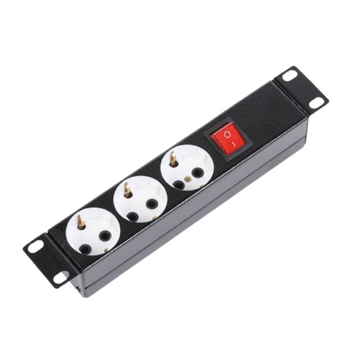Блок розеток ЦМО БР-3П-10-9005 для телекоммуникационного шкафа типоразмера 10" рассчитан на три потребителя. Укомплектован выключателем, тремя выходными портами Schuko (горизонтальное расположение для удобства подключения коленчатых штекеров) и выходным C14. Поставляется без шнура питания.