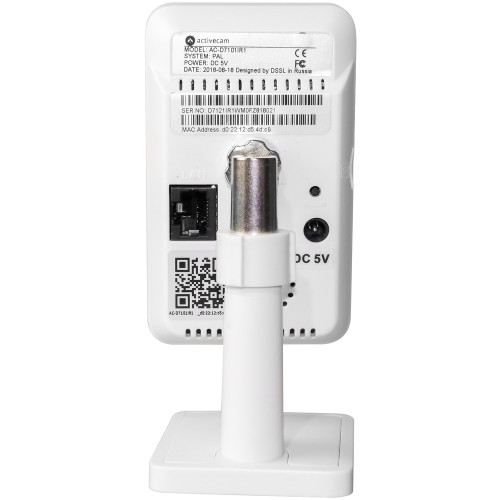 Модель ActiveCam AC-D7101IR1 выполнена в форм-факторе Cube и оборудована объективом с фокусным расстоянием 3.6 мм при F1.8, углы обзора 52.9° / 39.3°. Входящий в комплект поставки поворотный кронштейн позволяет без труда осуществлять монтаж изделия на поверхностях с любым углом наклона. Набор интерфейсов представлен: сетевым разъемом RJ-45 и гнездом для подключения БП 5В. Наличие двустороннего аудиосопровождения (встроенные динамик и микрофон) позволяет регистрировать и отправлять звуковые сообщения к месту инсталляции прибора. Также камера располагает встроенным архивом (Edge Storage) – локальная запись данных на карту памяти стандарта microSD объемом до 32 ГБ, превращающая прибор в автономный видеорегистратор и удваивающая надежность сохранности отснятых видеоматериалов.