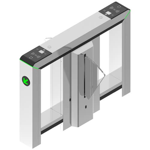 Центральная тумба турникета ZKTeco Mars-F1222 с двумя выпадающими створками укомплектована контроллером, считывателем карт и отпечатков пальцев, LED-индикаторами направления, разрешения и запрещения прохода, ИК-датчиками. В линии с другими тумбами формирует две линии прохода.