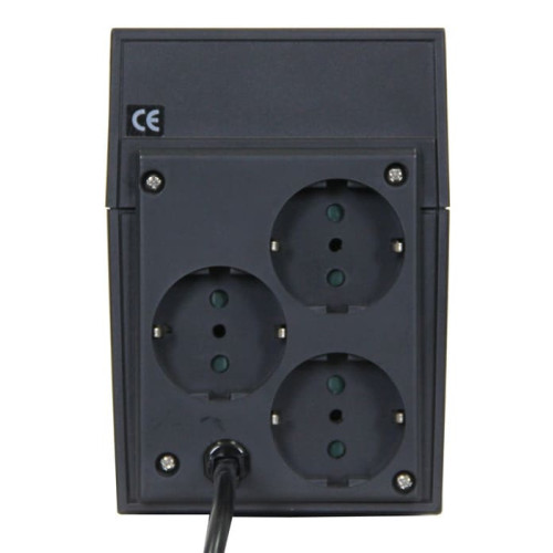 ИБП Powercom Raptor RPT-600AP EURO USB представляет собой устройство топологического типа Line-Interactive и укомплектован встроенным стабилизатором для получения напряжения на выходе в виде аппроксимированной синусоиды. Рассчитан на три потребителя, подключаемых через EURO-разъемы с резервным питанием. Номинальная мощность — 600 ВА. Общая нагрузка не должна превышать 360 Вт.