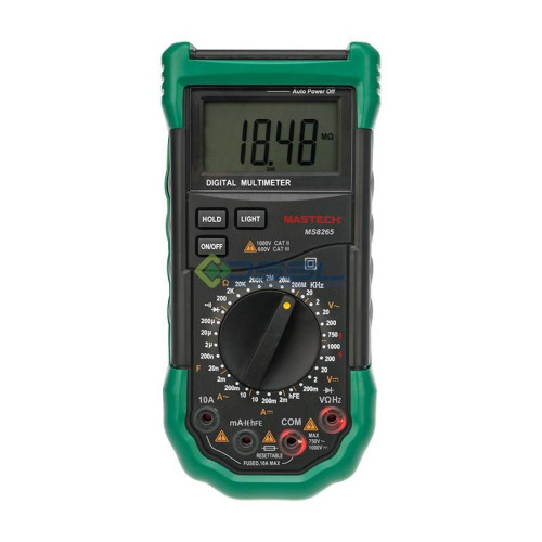 Профессиональный цифровой мультиметр Mastech MS8265 для замеров напряжения и силы AC и DC, сопротивления, емкости конденсаторов и частоты, проверки транзисторов и диодов, испытания электрических цепей на целостность оснащен LCD-дисплеем, зуммером, предохранителями (400 мА, 250 В и 10 А, 350 В).