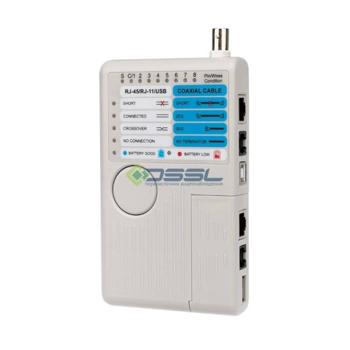 Тестер оснащен разъемами RJ-45, RJ-11, BNC и USB. Питание — батарея «Крона» (тип 6F22, напряжение 9 В, в комплекте). Размер — 144×86×25.5 мм. Вес — 202 г (без батареи). В комплект входят концевая муфта витой пары с гнездовым разъемом BNC, футляр.