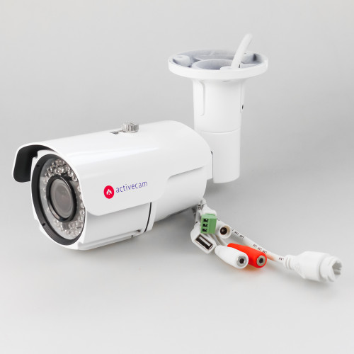 Корпус ActiveCam AC-D2123IR3 выполнен в форм-факторе небольшого цилиндра и соответствует стандарту защиты от погодных воздействий IP67. Сверху к камере крепится защитный козырек с регулируемым выступом, с тыльной стороны интегрирован поворотный кронштейн. В набор интерфейсов модели входят: стандартный сетевой разъем RJ-45, аудиовход/выход и гнездо подключения БП. Порт RJ-45 поддерживает функцию питания по единому кабелю Ethernet (PoE), что облегчает процесс инсталляции и сокращает затраты на закупку и прокладку силовых кабелей к месту установки устройства. Наличие двустороннего аудиосопровождения позволяет слушать, записывать и отправлять звуковые сообщения к месту установки устройства. Камера комплектуется мегапиксельным вариофокальным объективом с фокусными расстояниями 2.8-12 мм (углы обзора 103°-30.8° / 74°-23.3°). Архив Edge Storage объемом до 128 Гбайт может быть сформирован путем подключения USB-накопителя к соответствующему порту.