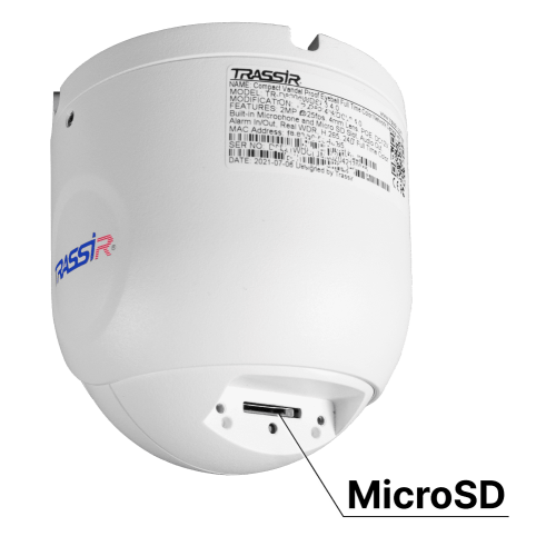 TR-D8221WDCL3 (4 мм) оснащена слотом для microSD емкостью до 128 Гбайт. По умолчанию после установки SD-карты камера активирует функцию записи архива по сигналу детектора движения. Записанный архив можно посмотреть через приложение TRASSIR-Client — при условии подключения камеры к TRASSIR Cloud. Для корректной работы SD-карты ее нужно предварительно отформатировать.