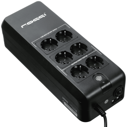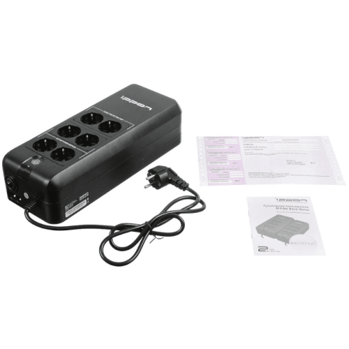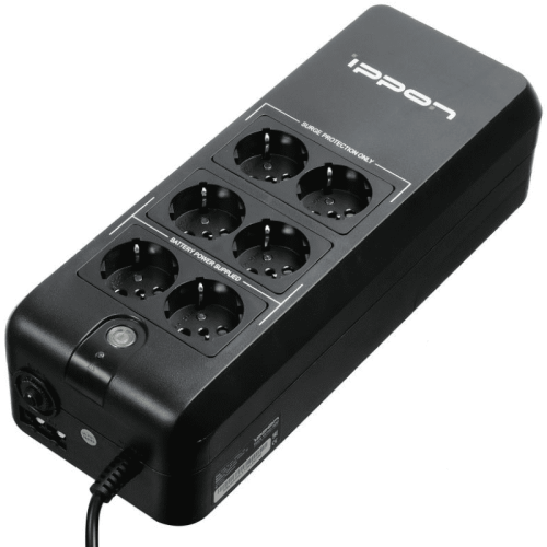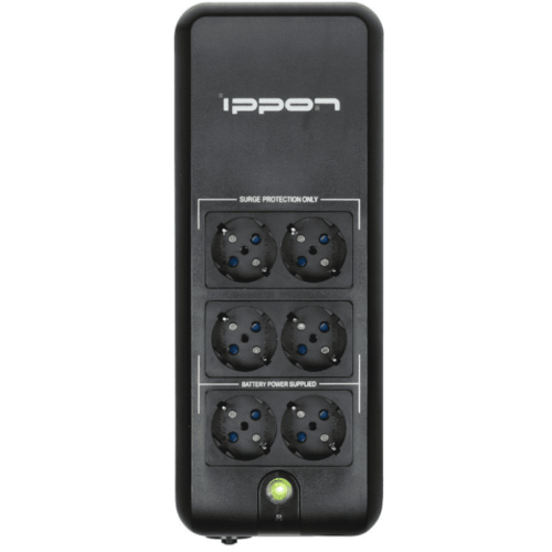 Резервный (Off-Line) ИБП Ippon Back Verso 800 рассчитан на параллельное подключение до шести устройств через разъемы Schuko (Euro) с фильтрацией помех: четыре — с поддержкой АКБ, два — без поддержки. Форма сигнала на выходе при сетевом — синусоида, от АКБ —– модифицированная синусоида. Полная мощность ИБП — 800 ВА, активная — 420 Вт.