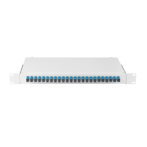 Оптический кросс Nikomax NMF-RP24SCUS2-WS-ES-1U-GY для коммутации оптических волокон поставляется с двадцатью четырьмя одинарными проходными адаптерами типа SC.