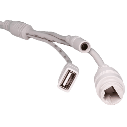 Модель поставляется с объективом 2.8 мм с углом обзора 88° — по горизонтали, 63° — по вертикали, 106° — по диагонали. Интерфейсы: сетевой порт RJ-45 с поддержкой PoE, разъем для подключения блока питания (БП в комплект не входит), USB 2.0 (для локальной записи на внешний USB-накопитель до 128 Гбайт) . Локальная запись данных предотвращает потерю информации при недоступности сети и позволяет использовать камеру в бессерверных CCTV. В камеру встроен микрофон — звук пишется одновременно с видео.