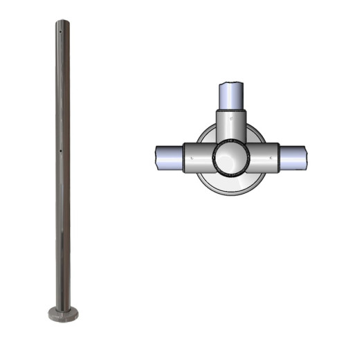 Стойка вертикальная 3V СВ-3 для формирования периметра Т-образной формы из секций модульного ограждения оснащена шестью гайками-заклепками, расположенными на двух уровнях по три под углом 90º. Гайки нужны для крепления стаканов устанавливаемых поручней.