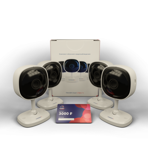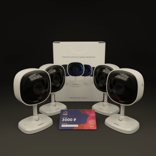 Комплект облачного видеонаблюдения TRASSIR CloudOffice1 состоит из четырех IP-камер TRASSIR TR-W2C1 (2.8 мм) и промокода на 3000 рублей для активации в личном кабинете TRASSIR Cloud. 3000 рублей хватает на 6 месяцев записи в облако архива с четырех камер — с настройкой тревожных уведомлений о движении, звуке и сигналах встроенного детектора саботажа, экспортом видео, расширенным функционалом управления камерой.