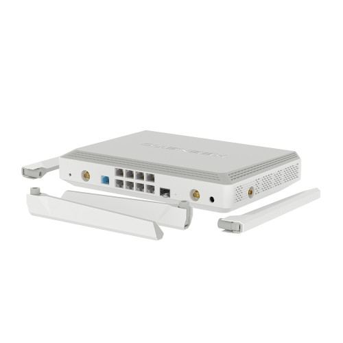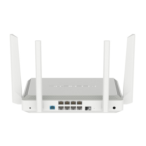 Роутер Keenetic KN-2710 оборудован четырьмя внешними высокоточными антеннами MU-MIMO (RP-SMA) с усилением 5 дБи, передающими данные на несколько устройств одновременно по разным пространственным потокам, девятью гигабитными RJ-45 (WAN или LAN в зависимости от настройки ролей), SFP, двумя USB-интерфейсами (USB 3.0, USB 2.0) для подключения LTE-модема и USB-накопителя, двумя кнопками с назначаемыми функциями.