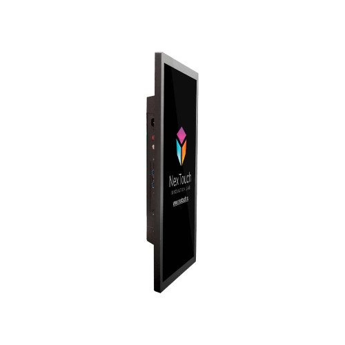 24-дюймовая интерактивная панель NexTouch IFCNV1PNT24 построена на базе ЖК-сенсора с проекционно-емкостным стеклом PCAP, оборудована видеовходами HDMI, VGA, четырьмя USB, RJ-45, аудиовходом, выходом, Wi-Fi-антенной.