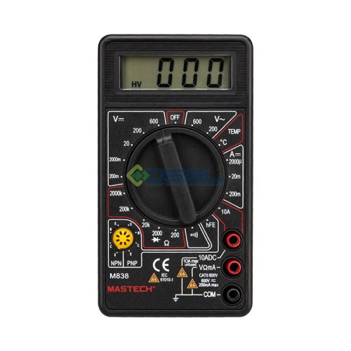 Портативный цифровой мультиметр Mastech M838 для измерения напряжения AC и DC, сопротивления, силы DC, температуры, испытания транзисторов и диодов (прямое падение напряжения), прозвонки целостности цепи оснащен 3.5-разрядным ЖК-дисплеем, генератором сигнала, термопарой К-типа (–20 ºС… +300 ºС).