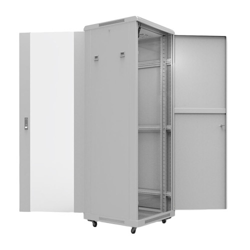 Напольный шкаф Rexant 04-2314 предназначен для размещения активного и пассивного 19-дюймового оборудования высотой 22U. Прочный каркас из листовой стали 2 мм выдерживает нагрузку до 800 кг и защищён порошковым покрытием RAL7035 с предварительным фосфатированием. Передняя дверь из 5-мм тонированного ударопрочного стекла в металлической раме оборудована замком, а задняя металлическая дверь с откидной ручкой обеспечивает быстрый доступ к кабельным соединениям; обе створки могут навешиваться справа или слева и открываться на 220°. Съёмные боковые панели на защёлках упрощают обслуживание, а крышка снабжена панелями под вентиляторный модуль. Верх и низ корпуса имеют съёмные вводные панели для аккуратного завода кабелей. Внутри установлены две пары регулируемых по глубине 19″ направляющих со шкалой юнитов, что позволяет точно позиционировать оборудование даже нестандартной длины; полезная глубина монтажа достигает 720 мм. Регулируемые опоры входят в комплект и обеспечивают стабильность на неровном полу. Шкаф поставляется в разобранном виде в двух гофрокоробах, что сокращает расходы на транспортировку и облегчает подъём на объект. Степень защиты корпуса — IP20.