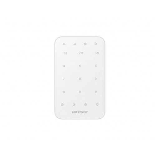 Беспроводная сенсорная клавиатура Hikvision KeyPad (DS-PK1-E-WE) со светодиодной подсветкой оборудована бипером, последовательным портом, тампером, цифровыми и функциональными клавишами пожарной экстренной и медицинской тревог, постановки на охрану в режимах наличия и отсутствия людей на объекте, снятия с охраны. Дистанция связи с контрольной панелью охранной сигнализации AX PRO на открытом пространстве достигает 1200 м.