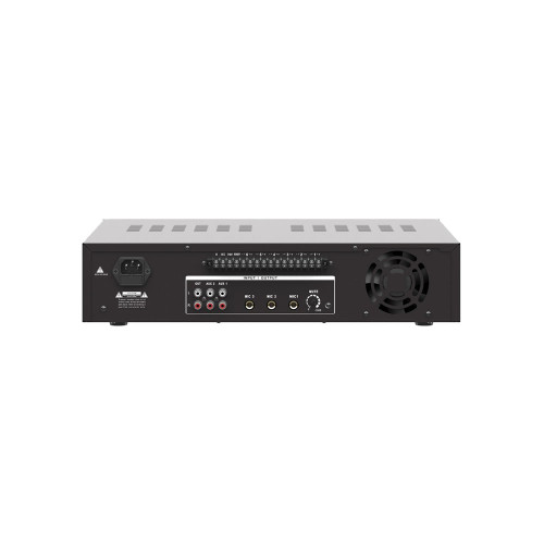 - Универсальные аудиовыходы (4-контактные клеммные колодки): высоковольтные — 100 V, 70 V, низкоомный — 8 Ом. Два выхода RCA.