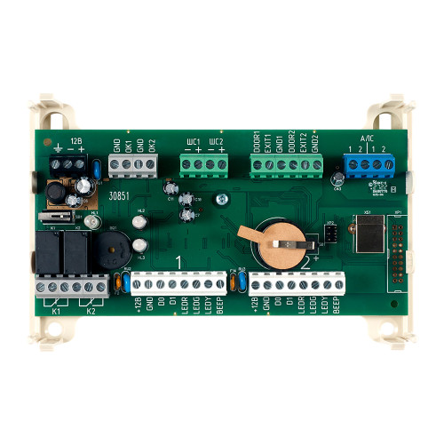 Модуль контроля доступа Рубеж МКД-2-R3 предназначен для управления точками прохода и интеграции считывателей в адресную систему RS-R3. Встроенный микропроцессор обеспечивает питание и опрос двух считывателей по интерфейсу Wiegand-26, преобразует полученные коды и передаёт их в прибор по двухпроводной АЛС. Устройство коммутирует электромагнитные замки, турникеты и другие исполнительные механизмы, контролируя факт прохода с помощью датчиков двери и СМК. МКД-2-R3 поддерживает работу с одной двусторонней точкой или двумя односторонними, регистрируя события в обоих направлениях. На плате расположены два релейных выхода и два выхода типа «Открытый коллектор» для выносной индикации, а светодиодная индикация отображает состояние питания, связи и блокировки. Модуль совместим с биометрическими считывателями BioSmart 5M и FS-80, а также устанавливается на DIN-рейку (крепёж приобретается отдельно). Широкий диапазон рабочих температур от –10 °C до +55 °C и степень защиты IP30 позволяют эксплуатировать устройство в помещениях различного назначения, а средний срок службы 10 лет гарантирует надёжность и низкую стоимость владения.