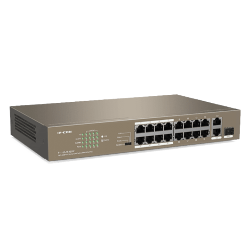 PoE-коммутатор IP-COM F1118P-16-150W оборудован шестнадцатью портами Fast Ethernet RJ-45 с PoE, двумя гигабитными uplink: одним RJ-45, одним комбинированным (RJ-45, SFP).