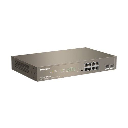 PoE-коммутатор IP-COM G1110P-8-150W оборудован десятью гигабитными портами: восемью RJ-45 с PoE и двумя SFP.