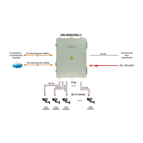 Управляемый агрегирующий PoE-коммутатор Osnovo SW-80802/WLU рассчитан на круглогодичную уличную работу: защита корпуса от пыли и влаги соответствует стандарту IP66, диапазон рабочих температур — -50 ºС... +50 ºС, предусмотрен набор гермовводов и безвентиляторная конвекционная система термостабилизации с нагревательным элементом.