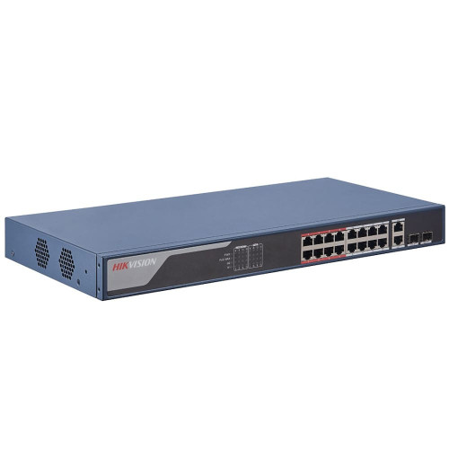 Управляемый PoE-коммутатор Hikvision DS-3E1318P-EI укомплектован 16 FE-портами RJ-45 с поддержкой PoE, двумя комбинированными GE-портами (G1 и G2): RJ-45 — для подключения к сети по витой паре и SFP — по оптоволоконному кабелю. Общий бюджет РоЕ — 230 Вт, на порт –— 30 Вт, приоритетное распределение РоЕ для портов 1 ~ 8. В режиме Extend максимальное расстояние передачи составляет 250 м для всех РоЕ-портов.