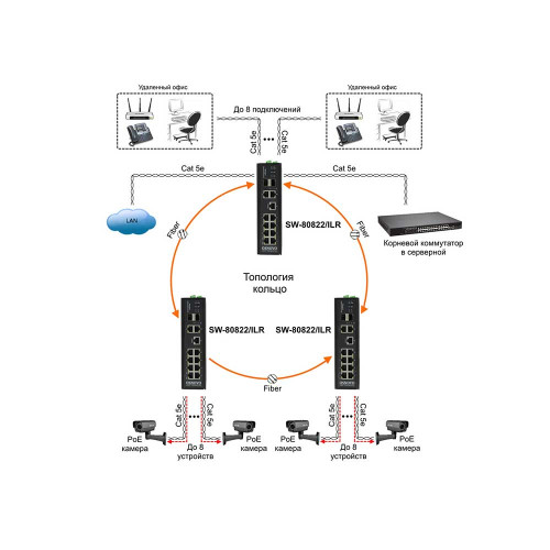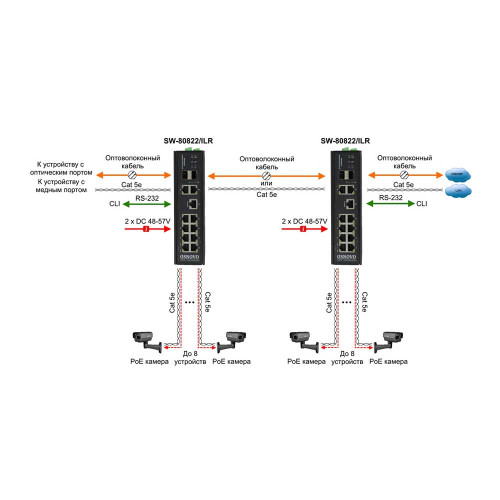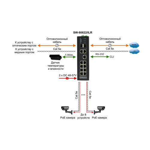 Управляемый промышленный РоЕ-коммутатор Osnovo SW-80822/ILR оснащен восемью GE-портами RJ-45 с поддержкой РоЕ и двумя гигабитными Combo (RJ-45+SFP) для стекирования и подключения к локальной сети через оптический кабель (SFP-модули в комплект не входят). Бюджет РоЕ — 360 Вт, на порт — до 90 Вт. Коммутационная способность матрицы — 20 Гбит/с. Скорость обслуживания пакетов — 1.488 mpps. Объем таблицы MAC-адресов — 8K. Буфер пакетов — 4 Мбайт. Топологии подключения — звезда, каскад, кольцо.