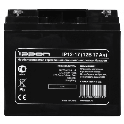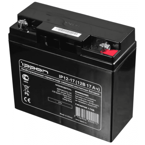 Батарея Ippon IP12-17 предназначена для обеспечения резервным и аварийным питанием оборудования подключенных к ИБП систем безопасности, телекоммуникации, аварийного освещения, охранной сигнализации, автоматизированного управления etc. Емкость — 17 А·ч, напряжение питания — 12 В (постоянный ток). Тип аккумуляторной батареи — необслуживаемая герметичная свинцово-кислотная.