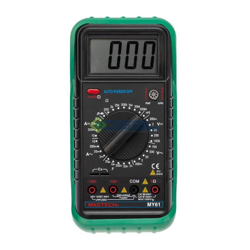 Универсальный цифровой мультиметр Mastech MY61 для измерения напряжения и силы DC и AC, сопротивления, емкости конденсаторов, прозвонки электроцепей, проверки диодов и транзисторов (NPN, PNP) оборудован 3.5-разрядным ЖК-дисплеем, зуммером.