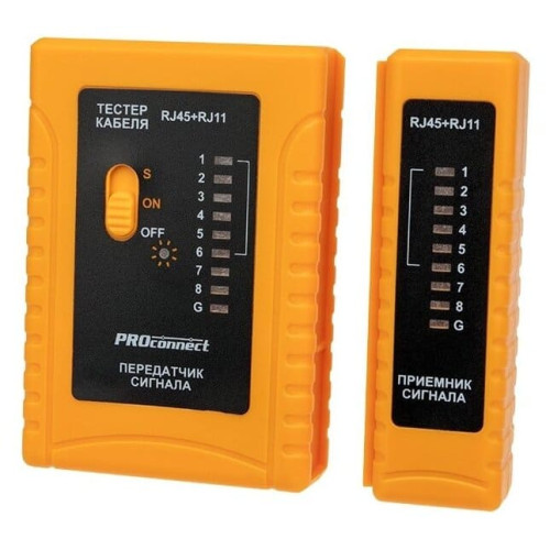 Тестер PROconnect 12-1006-4 витой пары и телефонного кабеля поставляется в корпусе из ударопрочного пластика, состоит из передатчика и приемника. Предусмотрена LED-индикация на приемнике и передатчике.