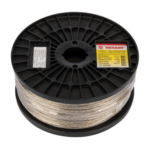 Трос Rexant 09-5330 для использования при статических нагрузках — монтажа различных подвесных конструкций изготовлен из высокоуглеродистой латунированной стальной проволоки с ПВХ-покрытием (оплетка).