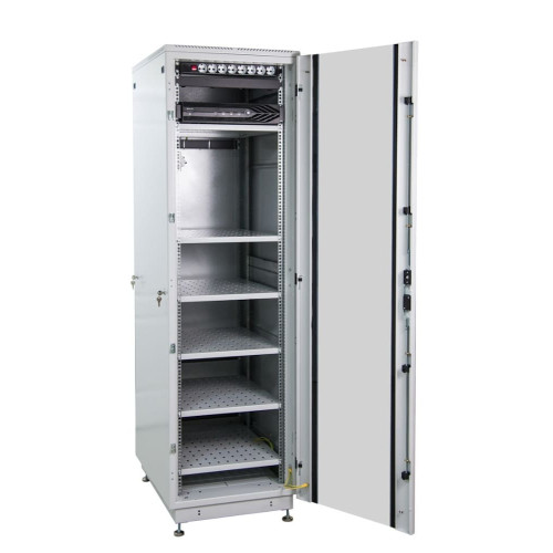 Сборно-разборный шкаф высотой 42 U состоит из каркаса повышенной жесткости, основания, крыши, двери с закаленным тонированным стеклом, боковых и задней стенок, вертикальных стоек, монтажных полок.