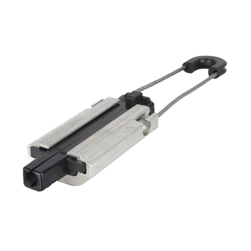 Анкерный зажим Nikomax NMF-AL-TCA-L-15 для крепления и удержания в натянутом состоянии самонесущего оптического кабеля на опорах воздушных линий электропередачи, связи, городского электрохозяйства (уличного освещения, наземного электротранспорта), элементах зданий и сооружений состоит из корпуса, невыпадающих клиньев и стальной петли с коушем и пластиковой прокладкой для защиты троса и равномерного распределения нагрузки.