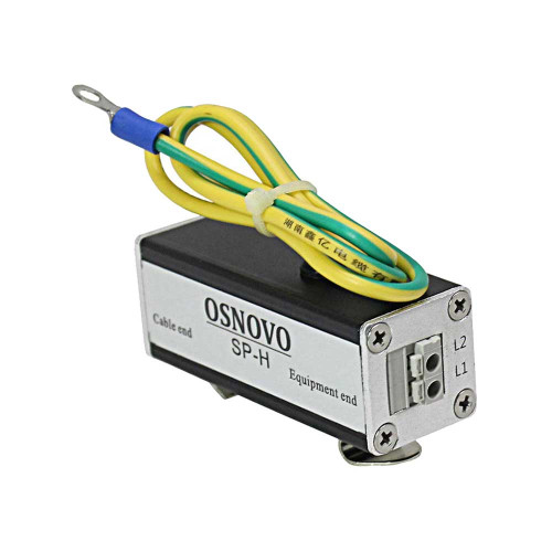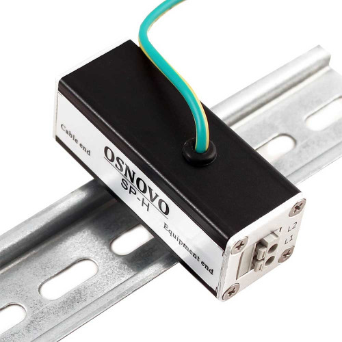 Тип подключения SP-H — под витую пару: две клеммных колодки (2pin) на вход и выход. Предусмотрен кабель заземления. Рабочие температуры — –40 ºС... +85 ºC. Установка — на DIN-рейку. Размер — 68×25×40 мм.