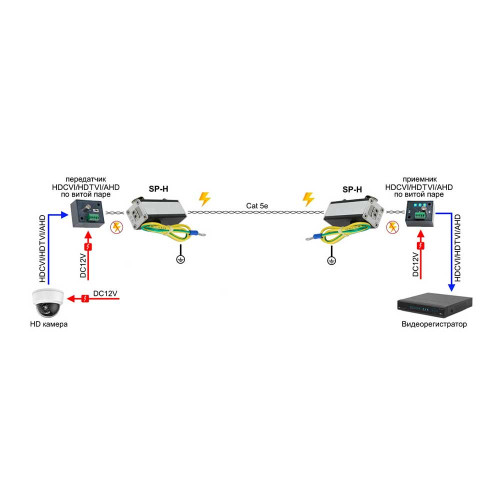 Устройство грозозащиты Osnovo SP-H рассчитано на работу в цепях передачи видеосигнала стандартов HD-CVI, HD-TVI, AHD.
