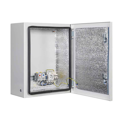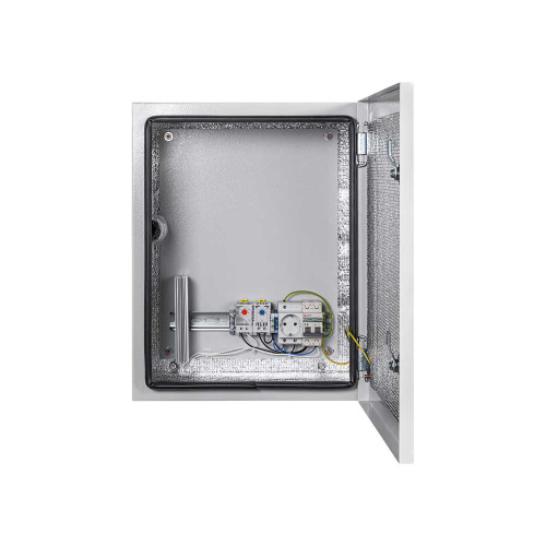 Универсальный монтажный шкаф Mastermann 13УТП+ (Ver. 2.0) адаптирован к круглогодичной уличной эксплуатации: защита корпуса от пыли и влаги — IP66, рабочая температура — –55 °C… +50 °C. Укомплектован обогревателем мощностью 100 Вт, автоматическим выключателем на 6 А, монтажной платой, двумя замками, двумя гермовводами, термореле. Предусмотрена защита от холодного пуска.