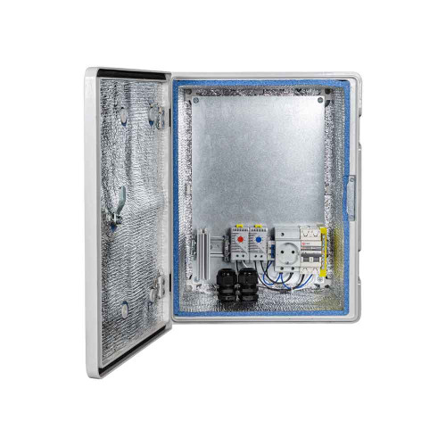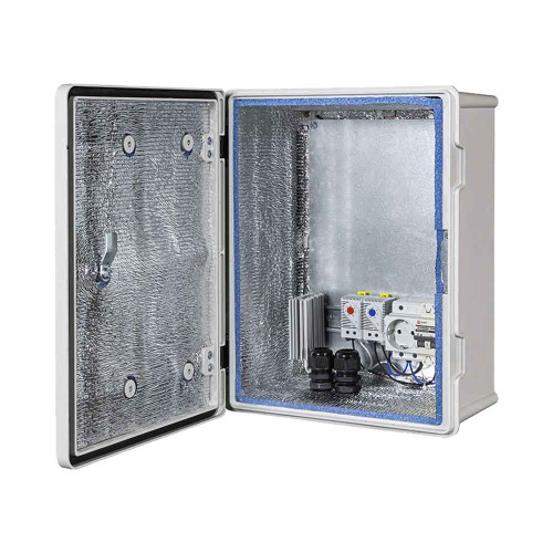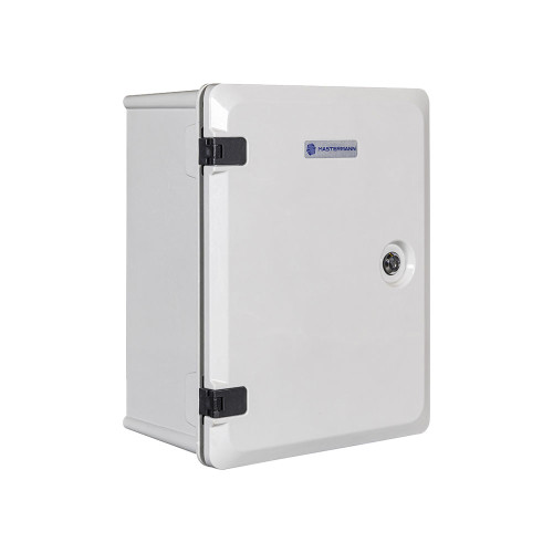 Универсальный монтажный шкаф Mastermann «Пластик-2УТП+» укомплектован обогревателем мощностью 50 Вт, автоматическим выключателем, монтажной платой, замком, двумя гермовводами, термореле, розеткой. Предусмотрена защита от холодного пуска.