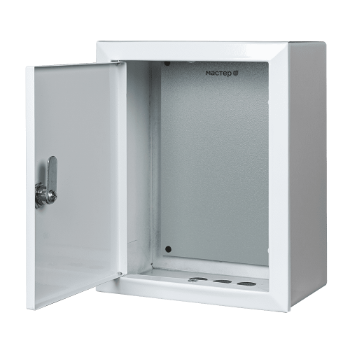 Электротехнический шкаф Mastermann «Мастер 1» изготовлен из листовой стали марки Ст3 толщиной 1.2 мм. В нижней части корпуса предусмотрено три отверстия под гермовводы. Листовые детали окрашены полиэфирной порошковой краской.
