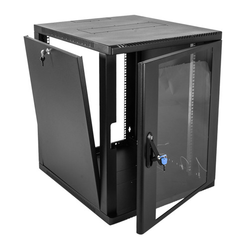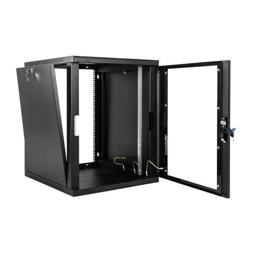 - Дверь универсальной навески со вставкой из тонированного ударопрочного стекла. Механическое крепление вставки повышает жесткость и обеспечивает простую замену стекла в случае необходимости.