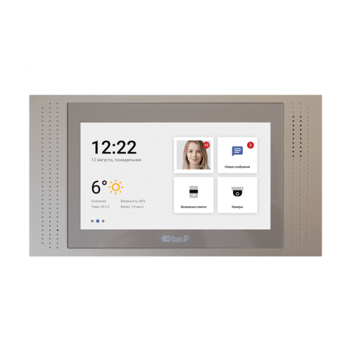 Абонентский монитор BAS-IP AT-10 gold для IP-видеодомофона построен на базе двух 4-ядерных процессоров, ОС Android 6.0. Оборудован 10" цветным емкостным IPS LCD-экраном (1280×800), камерой, разъемами microUSB, RJ-45 и RS-485, слотом для карты microSD емкостью до 32 Гбайт, микрофоном и динамиком. Рассчитан на 9 вызывных панелей, 32 IP-камеры, 8 дополнительных мониторов, 8 датчиков сигнализации (16 с модулем SH-16), дверного замка. Поддерживает настройку через графический и web-интерфейсы, ПО Link, управление с мобильного приложения BAS-IP Intercom, обновление ПО через сервер BAS-IP, web-интерфейс и SD-карту.