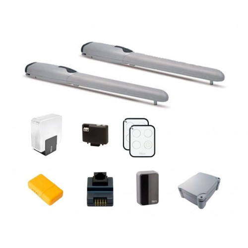Комплект Nice PROVIEWWINGO5BDKCE для автоматизации распашных ворот (створки длиной до 3.5 м, весом до 500 кг) состоит из двух приводов WG5000, электронного блока управления MC800, фотоэлементов Medium EPM, приемника OXIBD, двух пультов ДУ ON3EBD, блока программирования Pro-View, сигнальной лампы ELAC, IBT4N — адаптера шины BUS4T для подключения IT4WIFI и O-View к приводам и блокам управления.