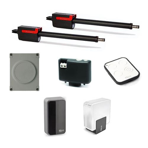 Комплект Nice TTN3724HSBDKIT для автоматизации распашных ворот со створками шириной до 3.7 м, весом до 450 кг состоит из двух электромеханических приводов TTN3724HS, блока управления MC824H, приемника OXIBD и двух пультов ДУ ON3EBD (приемник и передатчики с обратной связью).
