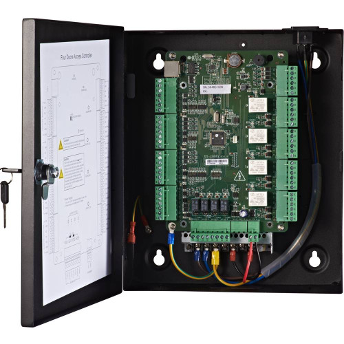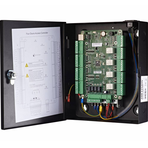 Сетевой контроллер СКУД Hikvision DS-K2804 предназначен для управления 4 дверьми, в том числе удаленного. Плата заключена в металлический корпус, базируется на 32-битном высокоскоростном процессоре. Устройство укомплектовано встроенными часами. Поддерживает 4 считывателя, интерфейс — Wiegand (W26/W34). Интерфейс сети — TCP/IP (самоадаптивный с поддержкой шифрования для повышения информационной безопасности). Объем памяти: 16 МБ — 10 000 карт, 50 000 событий, максимум цифр в номере карты — 20. Тревожный вход/выход (6/4): Door Magnetic×4, Door Switch×4, Case Input×4; выходы — Switch Relay×4, Alarm Relay×4. Поддерживает карты и считыватели сторонних производителей, различные типы карт (черный список, патруль, гость, принуждение, суперкарта, etc), два режима работы (офлайн/онлайн), синхронизацию времени через NTP. LED-индикатор отображает состояние питания, статус соединения, сигналы тревоги. Питание — DC 12 В/1А, потребление — до 3.5 Вт без нагрузки, до 100 Вт с нагрузкой, габариты — 285×237×69 мм. Рабочие условия: температуры -20 °C… +65 °C , влажность 10–90 % (без конденсата). Сертификация — CE, FCC. Гарантия — 3 года.