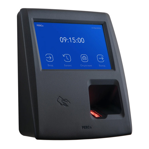 Терминал УРВ PERCo CR11.1 укомплектован мультиформатным (EM-Marin, HID, Mifare, NFC) считывателем, сканером отпечатка пальца, сенсорным ЖК-дисплеем.
