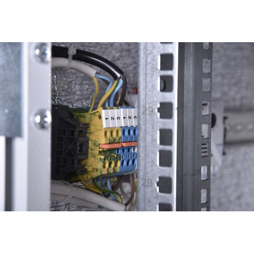 Датчик влажности, датчик положения двери и температурный датчик контролируют микроклимат. За корректность и безопасность работы системы отвечает оборудование ВРУ: автоматические выключатели, ограничитель перенапряжения, УЗО, индикатор напряжения, клеммник (клеммы 6 мм и 4 мм), модульная розетка. Наработка (непрерывная) на отказ вентиляторов R-FAN составляет 5.5 лет, обогревателя — 5 лет, климат-системы — 5.5 лет. Фильтры рекомендуется менять по мере загрязнения, но раз в два года — обязательно.