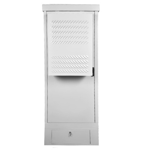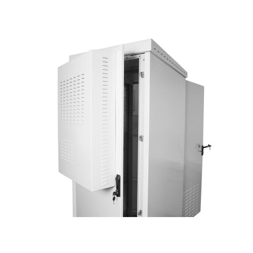 Предусмотрено заглушенное универсальное (выламывают нужное количество подходящего размера) отверстие для ввода кабелей. Один кабельный ввод — в комплекте. Замок можно заменить на антивандальный, цоколь — на 30-сантиметровый. Листовые детали покрыты порошковой краской светло-серого (RAL 7035) цвета. Габариты шкафа — 745×880×1575 мм, вес — 172 кг.