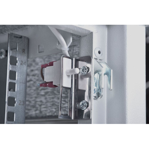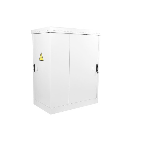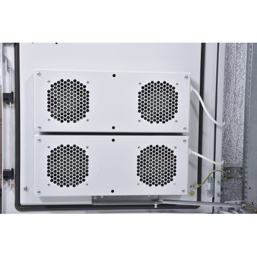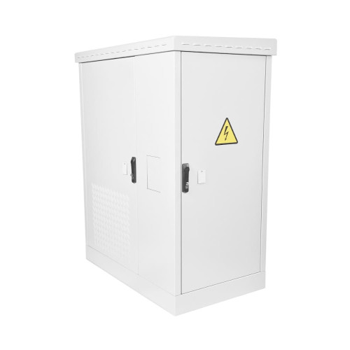 В основании и межсекционной стенке предусмотрены заглушенные отверстия для ввода кабелей. Конструктивно заглушки универсальны — можно выломать нужное количество отверстий подходящего размера. В комплект включены два кабельных ввода с гайкой М32 (MG32A-25G), 10 резиновых заглушек. Шкаф изготовлен из оцинкованной стали толщиной до 2 мм. Листовые детали покрыты порошковой краской светло-серого (RAL 7035) цвета. Размер — 1045×930×775 мм, вес — 148 кг. Питание — 230 Вт 50 гц. Шкаф ставят на ровную горизонтальную поверхность, крепят (цоколь) анкерными болтами.