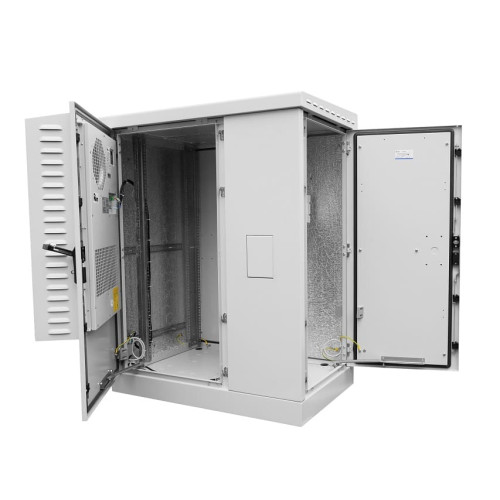 В основании и межсекционной стенке предусмотрены заглушенные отверстия для ввода кабелей. Конструктивно заглушки универсальны — можно выломать нужное количество отверстий подходящего размера. В комплект включены два кабельных ввода с гайкой М32 (MG32A-25G), 10 резиновых заглушек. Шкаф поставляется собранным (сварная конструкция), изготовлен из оцинкованной стали толщиной до 2 мм (кроме разделительной панели — она 2.5 мм). Листовые детали покрыты порошковой краской светло-серого (RAL 7035) цвета. Размер — 1045×880×1575 мм, вес — 228 кг. Питание — 230 Вт 50 гц. Монтаж — напольный, на ровную горизонтальную поверхность, крепят (цоколь) анкерными болтами.