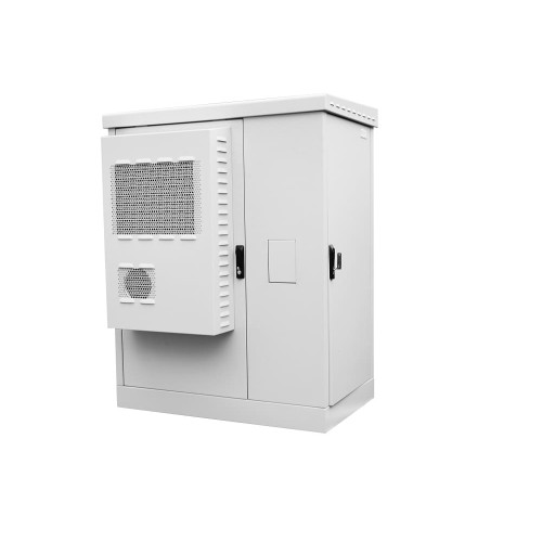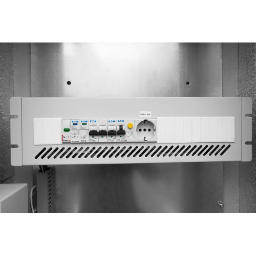 Секции разделены перфорированной панелью из оцинкованной листовой стали толщиной 2.5 мм. В специальном отсеке на фронтальной двери размещены кондиционер мощностью 2000 Вт и обогреватель мощностью 1000 Вт. В крышу вмонтированы выпускные вентиляционные фильтры, при необходимости заменяемые на внешние вентиляторы (в комплект не входят). В электротехнической секции находится оборудование вводно-распределительного узла (ВРУ): автоматические выключатели, ограничитель перенапряжения, УЗО, индикатор напряжения, клеммник (клеммы 6 мм и 4 мм), модульная розетка. Внутренние условия контролируют датчик влажности (гигростат — регулирует уровень влажности, управляя обогревателем), датчик положения двери и температурный датчик. Наработка обогревателя на отказ составляет 5 лет, климат-системы — 5.5 лет. Фильтры рекомендуется менять по мере загрязнения, но раз в два года — обязательно.